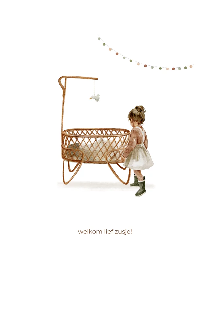 Origineel getekend geboortekaartje met een prachtige wieg en een grote zus kijkt over het randje. Bovenaan een vrolijke slinger. Mooi kaartje voor een tweede kindje met rosé folie. Dit kaartje kan je gebruiken voor een broertje of zusje. Hebben jullie meerdere kinderen, voeg dan kindjes toe uit de illustratie map of vraag even om hulp.