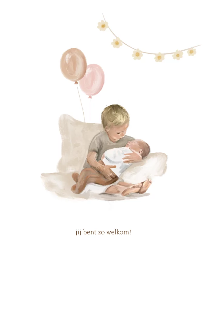 Een prachtig geschilderd geboortekaartje voor een tweede kindje met een grote broer met een baby op schoot. De mooi geverfde roze ballonnen en de slingers met regenboogjes maken het feest van de geboorte van jullie dochter compleet. Heeft jullie zoontje een andere haarkleur, kunnen we dit altijd aanpassen.
