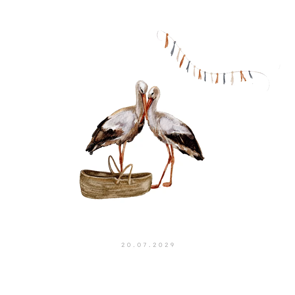 Getekend geboortekaartje ooievaars bij een mandje en goudfolie