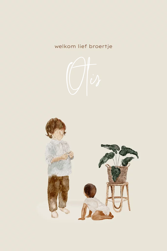 Getekend geboortekaartje voor een tweede kindje. Op het kaartje staat een grotere broer en een baby. Als decoratie een kamerplant op een krukje. Vervang de jongen door een meisje als jullie oudste een dochter is. De naam wordt gedrukt in goudfolie.