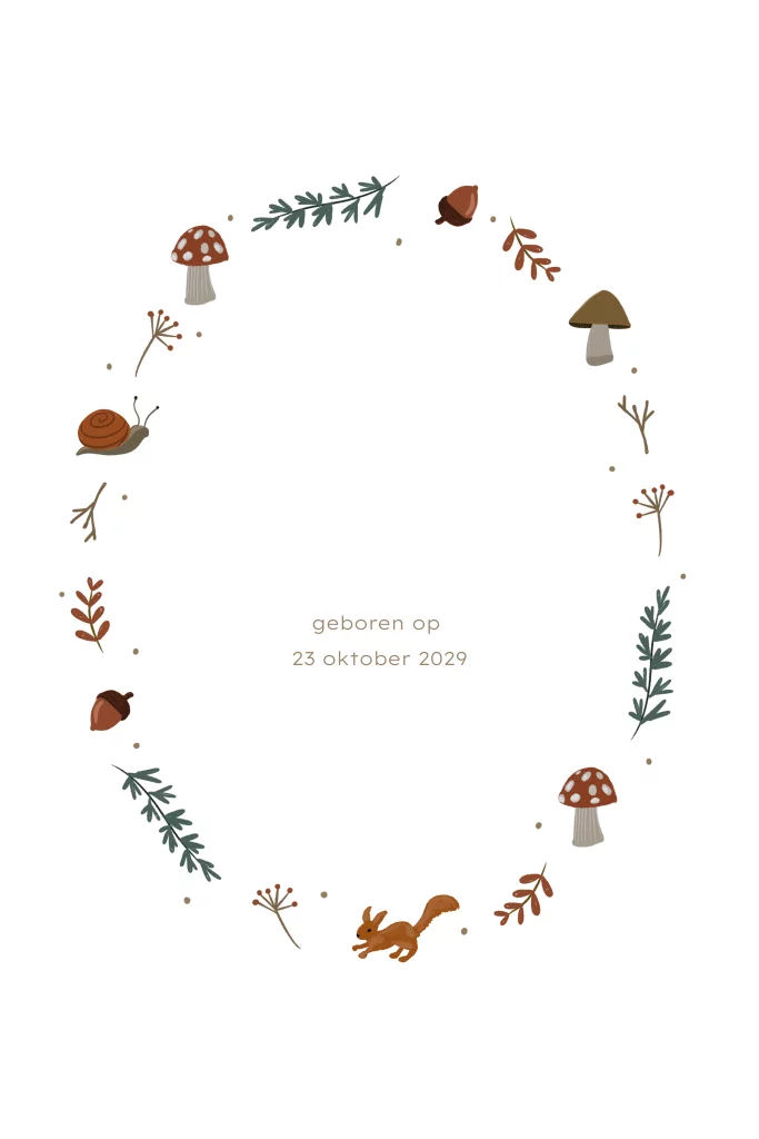 Geboortekaartje voor een herfst baby met een krans van getekende illustraties. In de krans staan takjes in bruine en groene kleuren en paddenstoelen. De naam wordt gedrukt in goudfolie, maar je kunt zelf een andere kleur kiezen. De ronde hoeken maken het kaartje extra lief.