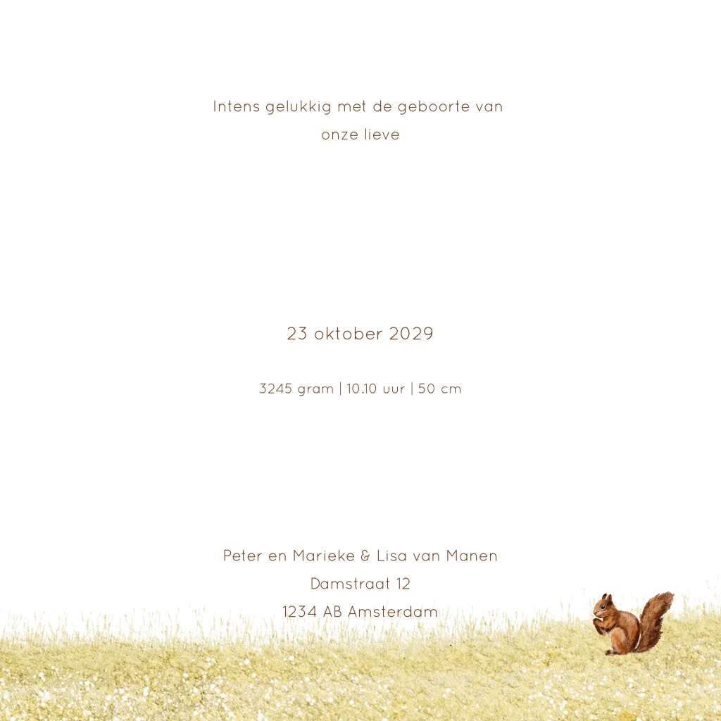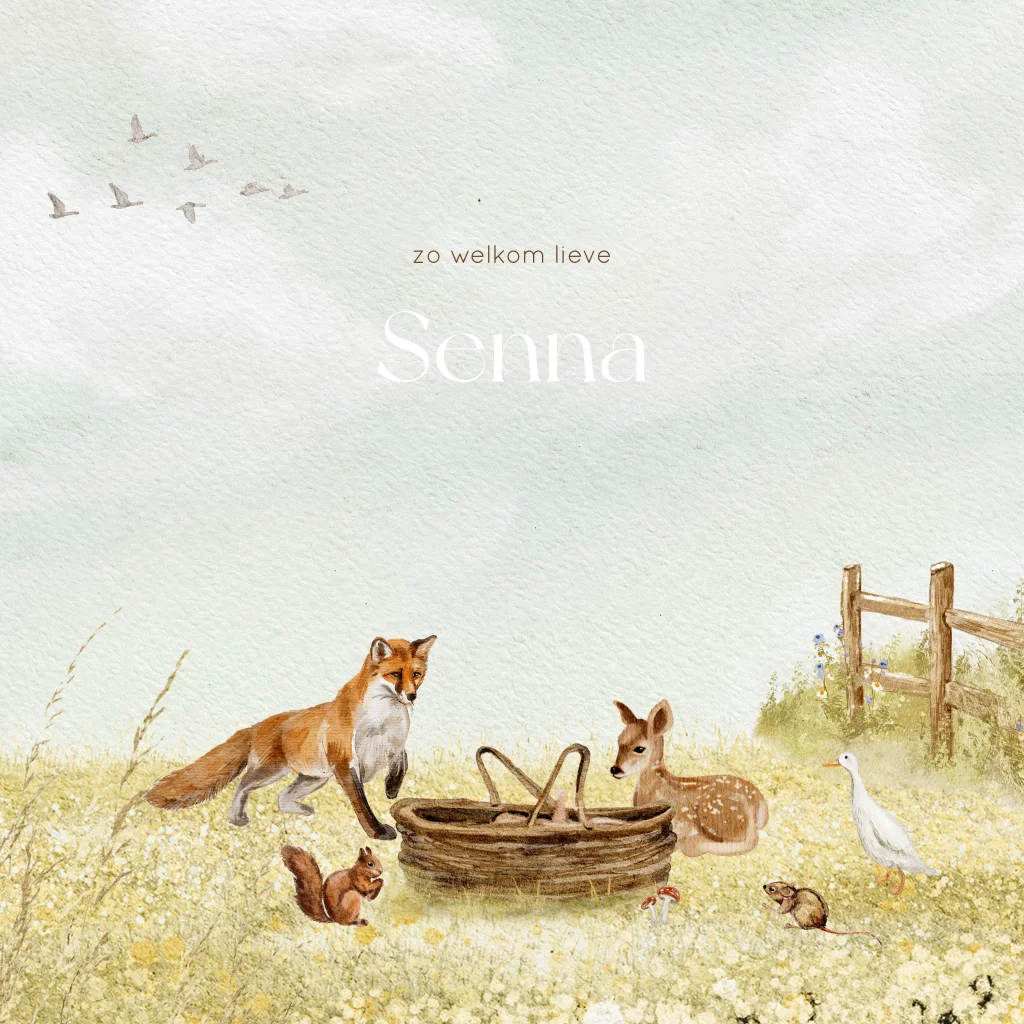 Onze kaartjes zijn versierd met prachtige aquarel illustraties van bosdieren zoals eekhoorns, konijntjes, hertjes en vossen, allemaal met liefde geschilderd. Het zachte, dromerige effect van aquarel past perfect bij de tedere boodschap van een geboortekaartje. Centraal staat een baby in een mandje, omringd door vriendelijke bosdieren, wat geborgenheid en liefde uitstraalt.