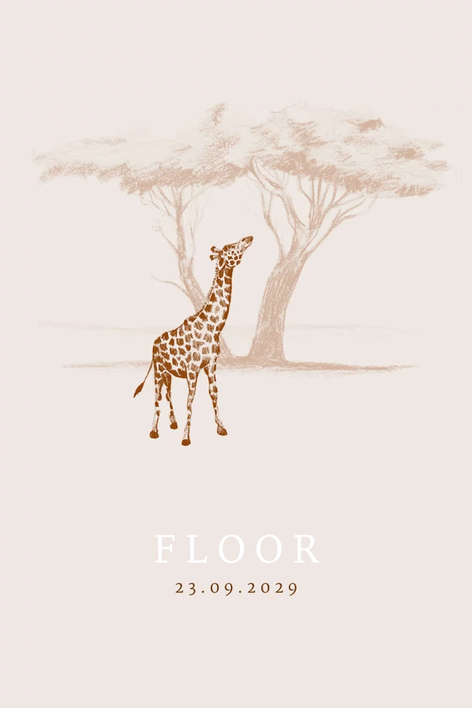 Uniek geboortekaartje in jungle stijl. Het kaartje heeft een roestbruine kleur en er staat een getekende giraffe op bij een boom. Het heeft een vintage uitstraling en het kaartje is leuk voor zowel een jongen als een meisje.