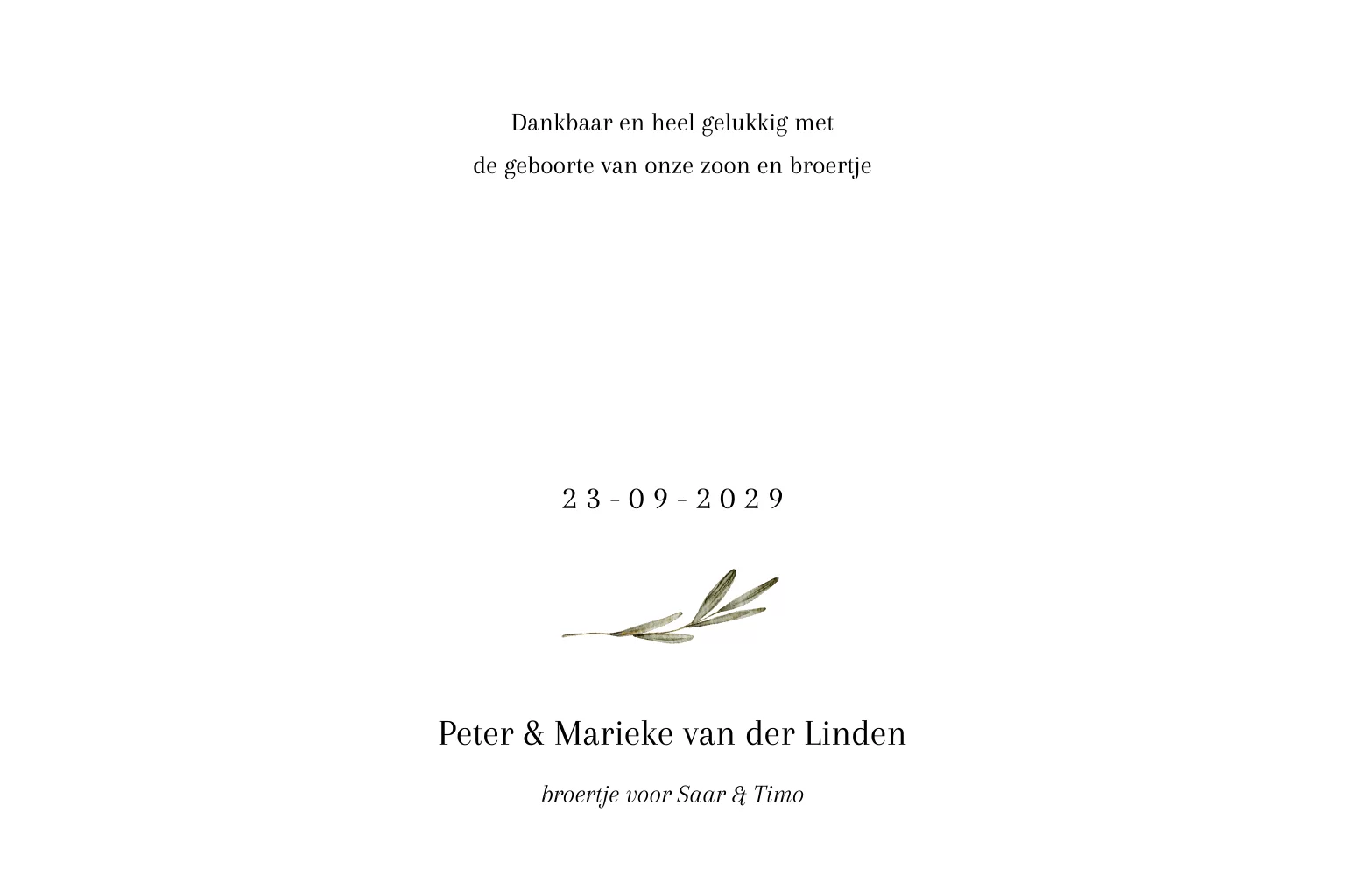 Ons assortiment van klassieke geboortekaartjes voor jongens straalt tijdloze elegantie uit. Met een prachtig kader en een subtiel getekend takje in glinsterend goudfolie, biedt deze kaart de perfecte gelegenheid om de naam van je pasgeboren zoon in de schijnwerpers te zetten. Het groene takje voegt een vleugje natuurlijke charme toe aan het ontwerp, waardoor het geheel een rustgevende en minimalistische uitstraling krijgt.