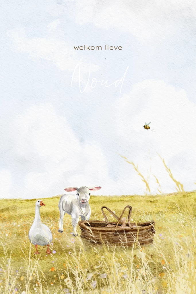 Wat een super lief lente geboortekaartje is dit. Een mooie geschilderde achtergrond van een blauwe lucht met een groene weide met grassen. In een mandje ligt een baby en daarnaast staat een lammetje en een gans. Je kunt de illustraties op dit kaartje zelf aanpassen, zodat je bijvoorbeeld ook andere lentedieren kunt toevoegen.