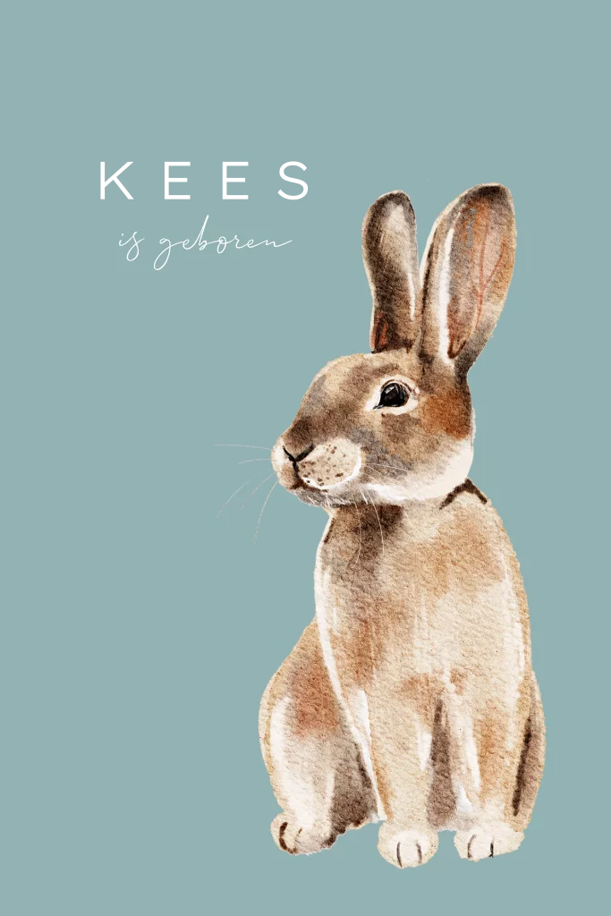 Ben je op zoek naar een lief maar toch stoer geboortekaartje voor een klein jongetje? Dit kaartje is zo tof voor jullie zoon. Op het kaartje staat een aquarel van een konijn. De naam kan ook in goudfolie of andere soorten folie worden gedrukt.