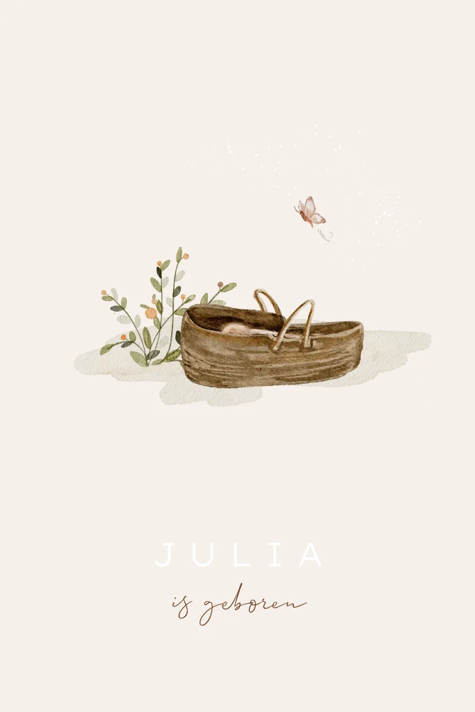 Ben je op zoek naar een lief zomers geboortekaartje voor een klein meisje? Dit kaartje is zo tof voor jullie dochter. Op het kaartje staat een aquarel van een baby in een rotan mandje met een roze vlinder en groen struikje. De roséfolie naam en kleine spetters maken het kaartje zo schattig.
