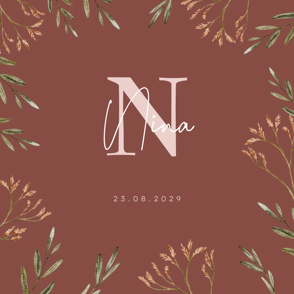 Roestbruin botanisch geboortekaartje met groene takjes en initiaal