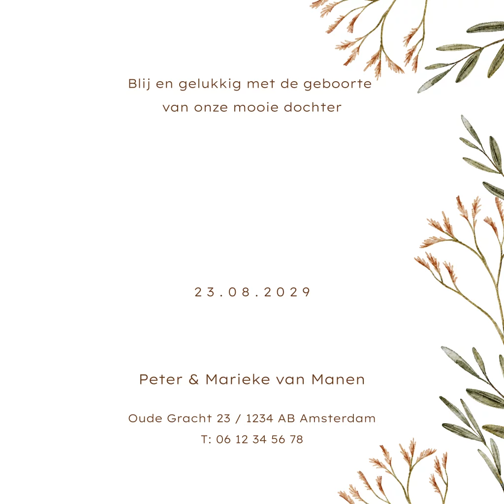 Onze collectie van prachtige botanische geboortekaartjes omvat dit roestbruine pareltje met groene takjes en een elegant initiaal, perfect voor de aankondiging van de geboorte van jullie dochter. De warme roestbruine achtergrond straalt een vleugje herfst uit, terwijl de verfijnde waterverf takjes een natuurlijk en minimalistisch tintje toevoegen. Het middelpunt van de kaart wordt gevormd door een prachtig initiaal en de naam van jullie dochter, gedrukt in schitterend goudfolie.