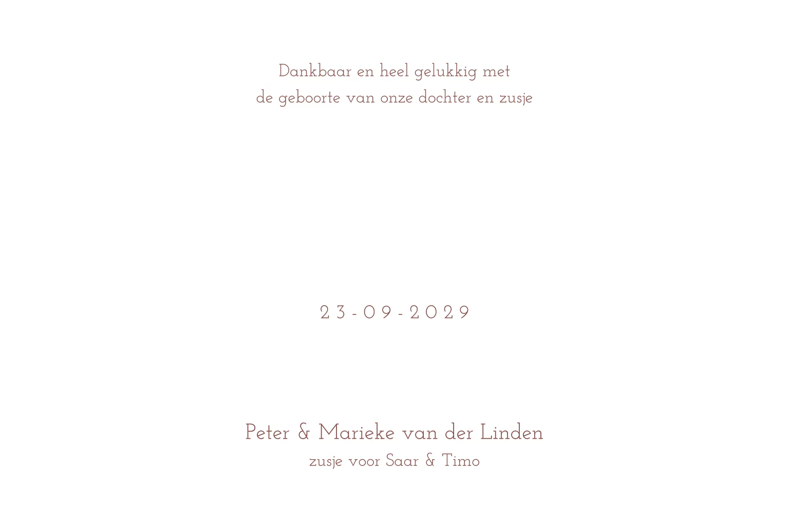 Roestbruin geboortekaartje voor een meisje met een initiaal. De achtergrond is een mooie roestbruine kleur. De naam van jullie kindje wordt gedrukt in goudfolie, maar je kunt zelf een andere foliekleur kiezen. Stijlvol geboortekaartje voor een meisje, maar ook te gebruiken voor een jongen.