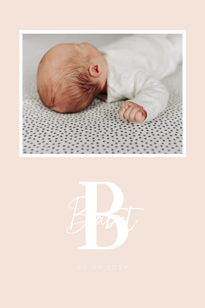 Lief geboortekaartje voor een meisje met een roze achtergrond. Daarop staat een foto, die je kunt vervangen door een foto van jullie eigen meisje. De naam wordt gedrukt in zwartfolie en daaronder staat een initiaal in het wit.