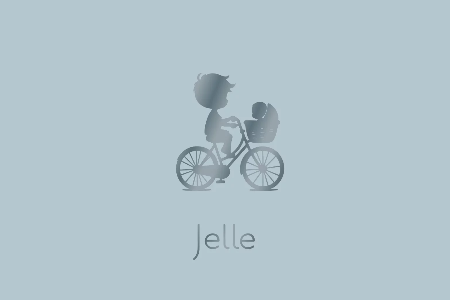Geboortekaartje met een silhouet voor een broertje. Op het kaartje staat een illustratie van een silhouet van een broer op een fiets en voorin de baby. De illustratie en de naam wordt afgedrukt in hoogglans. Verander de achtergrondkleur als jullie tweede een dochter is.