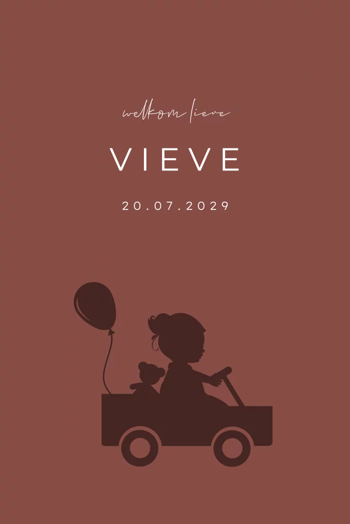 Silhouet geboortekaartje met een roestbruine achtergond. Het meisje met een knotje zit in een auto met een beertje achterop en een ballon. De naam is in goudfolie.