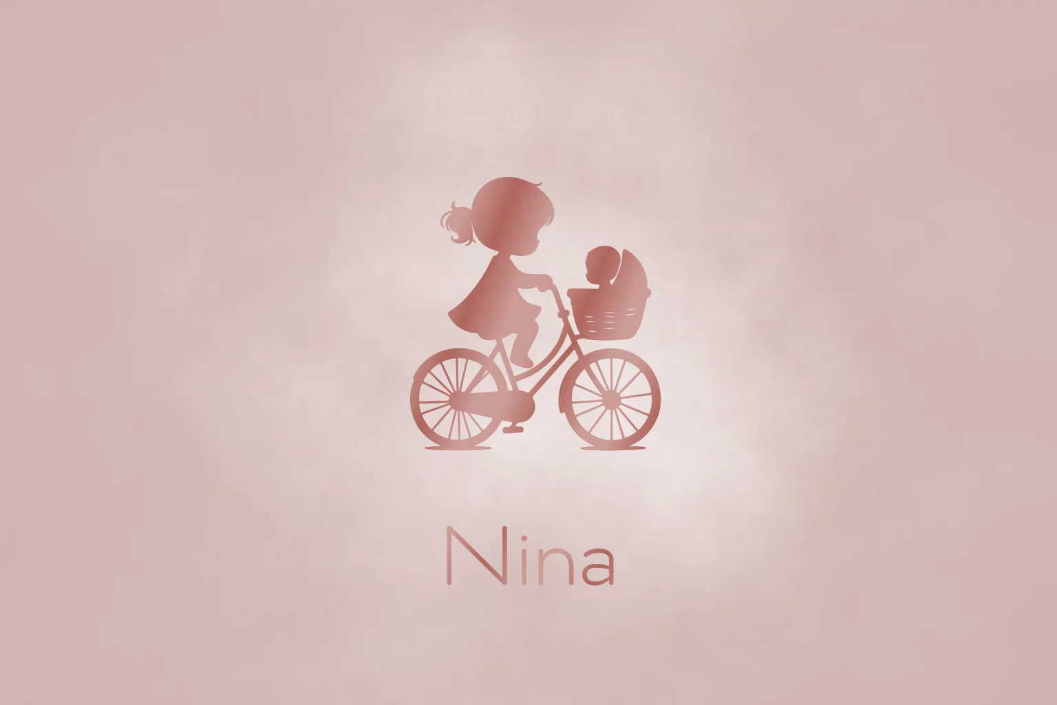 Silhouet geboortekaartje meisje met zusje op fiets in hoogglans