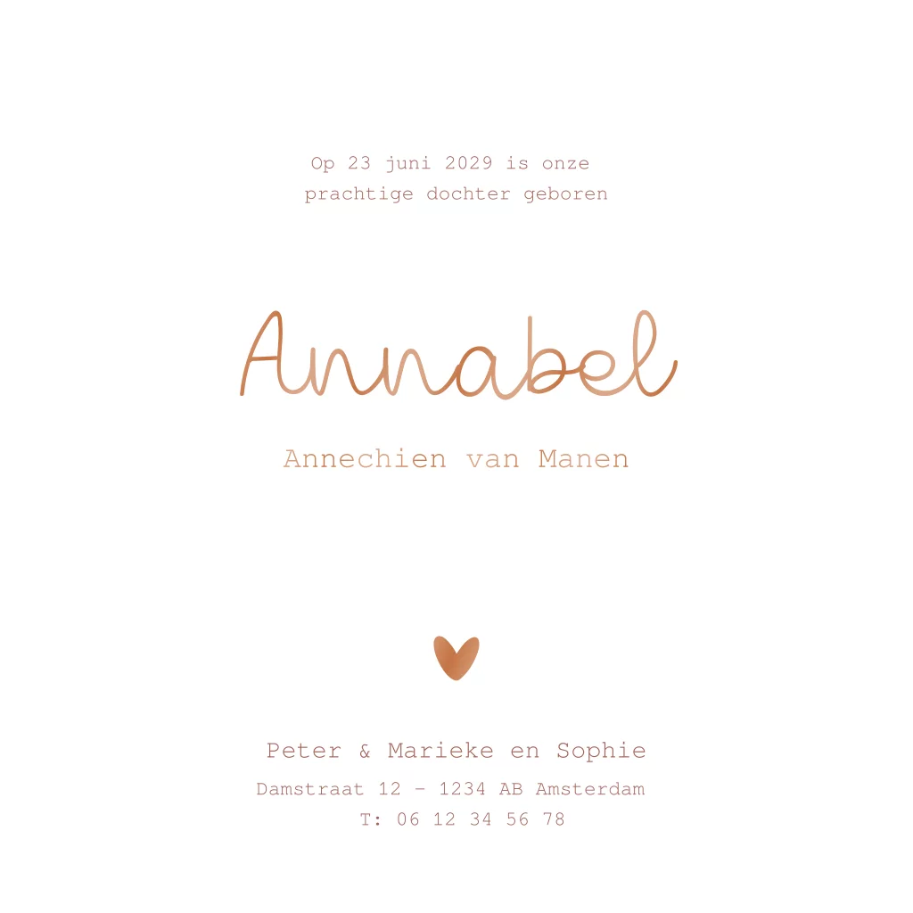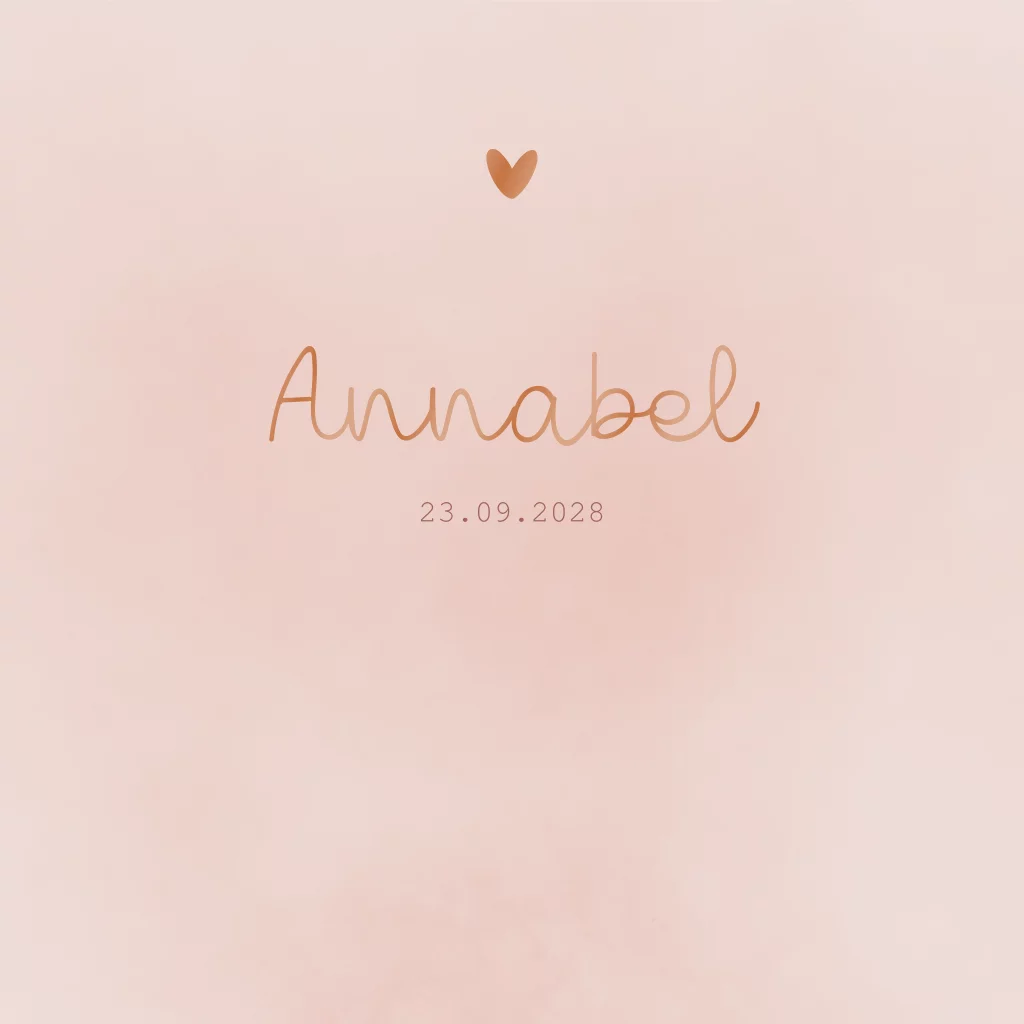 Vierkant geboortekaartje voor een meisje met een waterverf achtergrond en de naam in koperfolie. Boven de naam staat een folie hart.