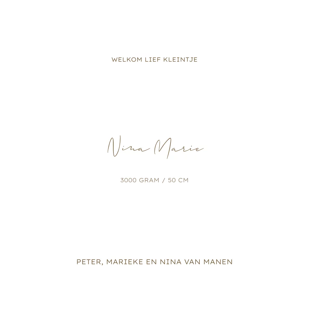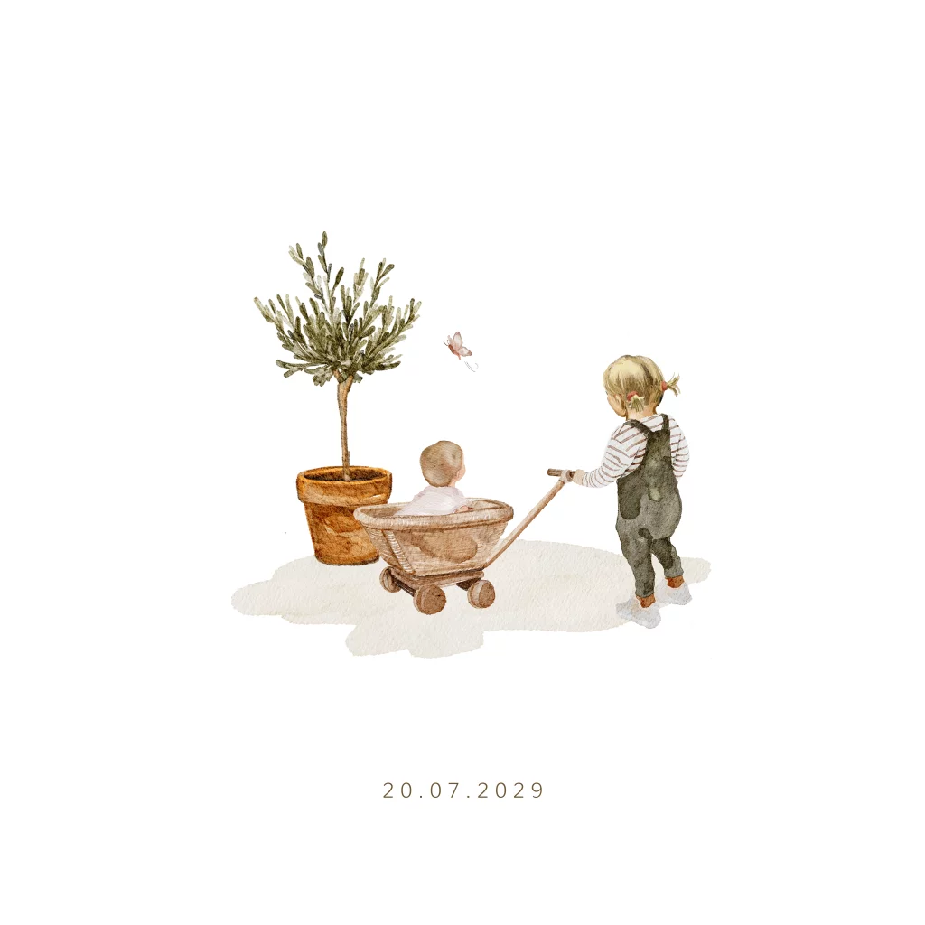 Lief vierkant geboortekaartje voor een zusje. In een bolderkar zit een baby meisje en daarbij loopt een oudere zus. Je kunt de illustraties ook vervangen door jongens. De vlinder en het struikje geven er een zomer effect aan. De naam staat in goudfolie en er staat een olijfboompje bij.