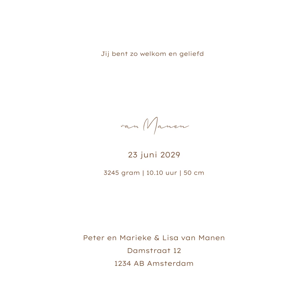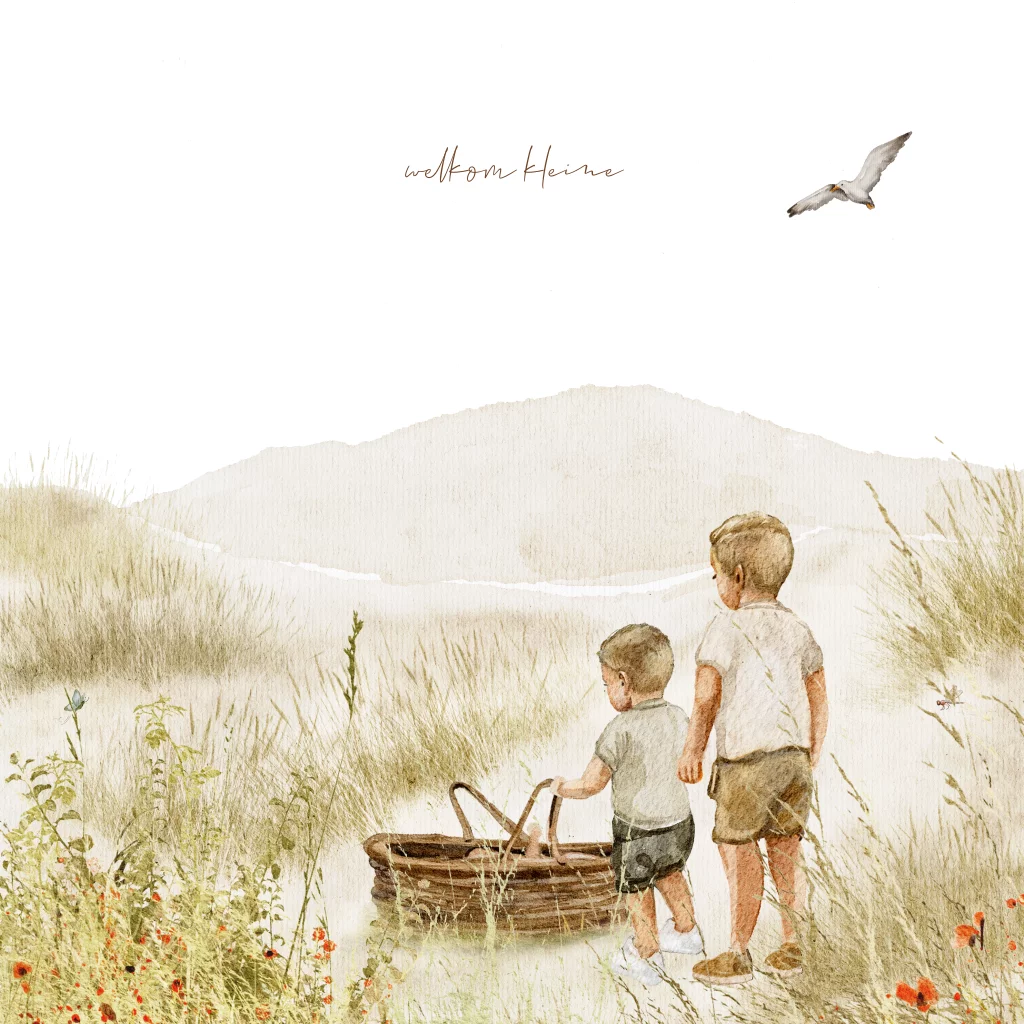 Uniek geschilderd geboortekaartje in een zomer thema. Het kaartje heeft een achtergrond met duinen en daarop een mandje met een baby. Naast het mandje staan twee broertjes. Deze illustraties kan je vervangen door andere kindjes. Maak helemaal zelf een persoonlijk geboortekaartje in een strand thema. De naam van jullie kindje wordt gedrukt in goudfolie.