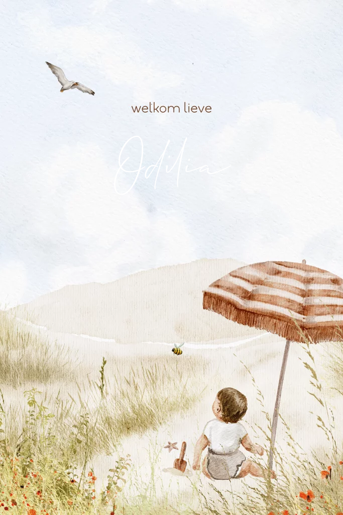 Uniek zomer geboortekaartje voor een klein meisje. De achtergrond heeft een blauwe lucht en op de voorgrond staan duinen en veldbloemen. Onder de parasol zit een klein meisje die kijkt naar een vliegende bij. De ronde hoeken geven het kaartje een zachte uitstraling. De naam wordt gedrukt in goudfolie.