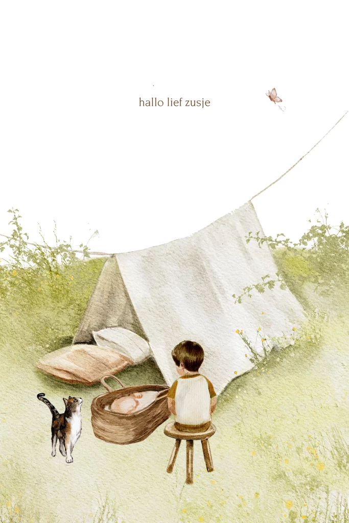 Krijgen jullie een baby in de lente of zomer, dan is dit kaartje misschien wel wat voor jou. Dit geboortekaartje is getekend en heeft een illustratie van een babymandje bij een tentje in een tuin. Op een krukje bij de baby zit een ouder broertje op een kruk. Je kunt ook andere kindjes toevoegen. Prachtig illustratief geboortekaartje met roséfolie en ronde hoeken.