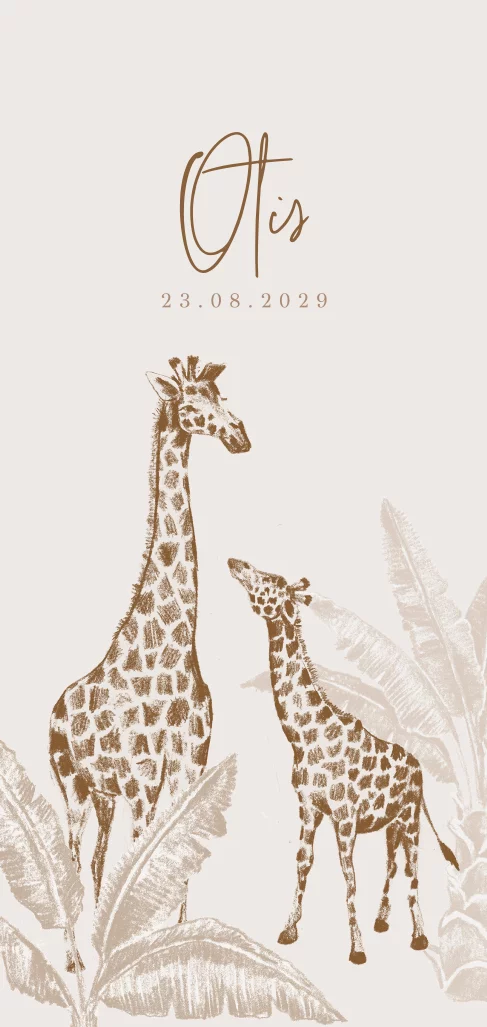 Lief jungle geboortekaartje met getekende giraffen. De girafjes staan tussen tropische bladeren. De kleuren van dit kaartje zijn bruin en het kaartje heeft ronde hoeken voor een wat zachter effect.