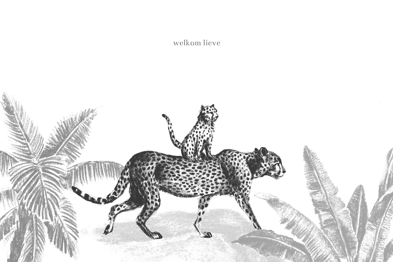 Wat een origineel en stoer geboortekaartje is dit. Het zwart witte kaartje heeft een getekende panter met een kleine luipaard op de rug. Ze lopen tussen grote bladeren. De naam staat in stoere letters en wordt gedrukt in echt zwartfolie voor een extra stoer effect.