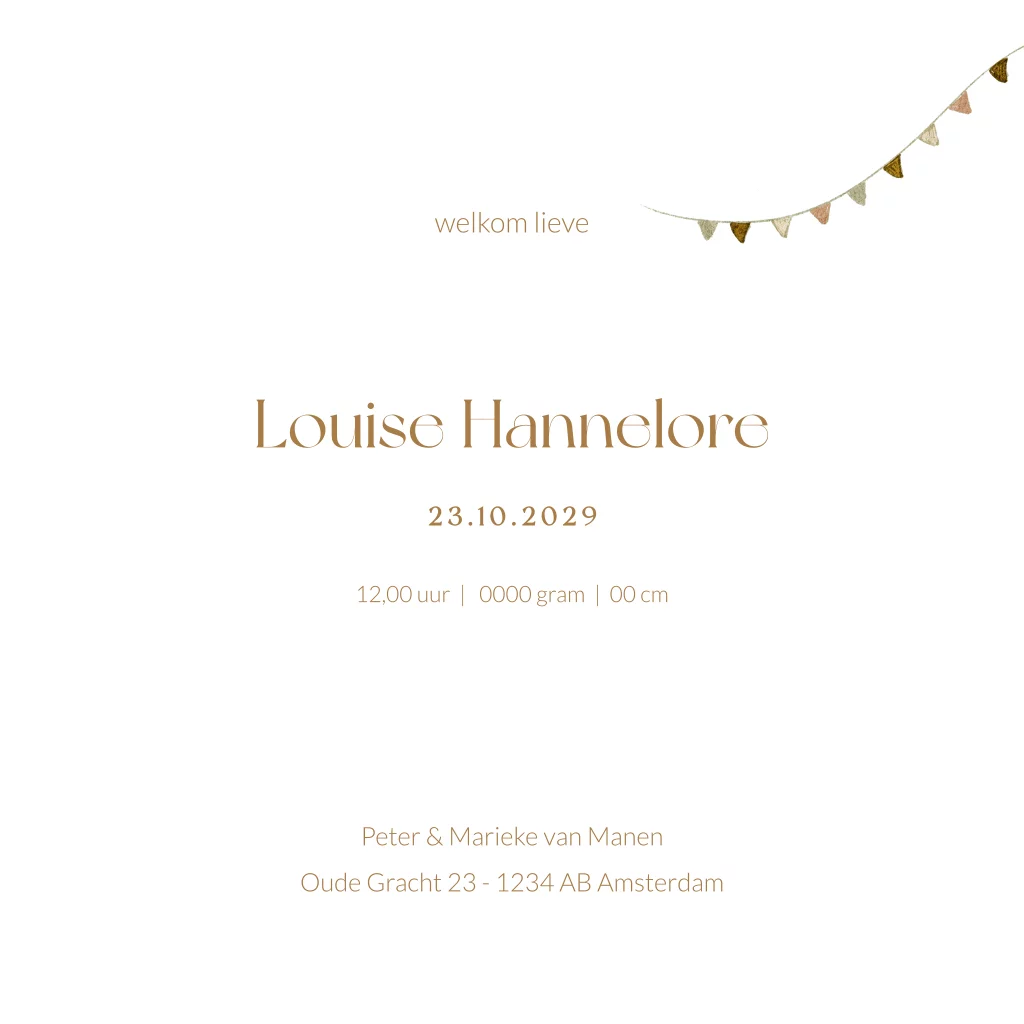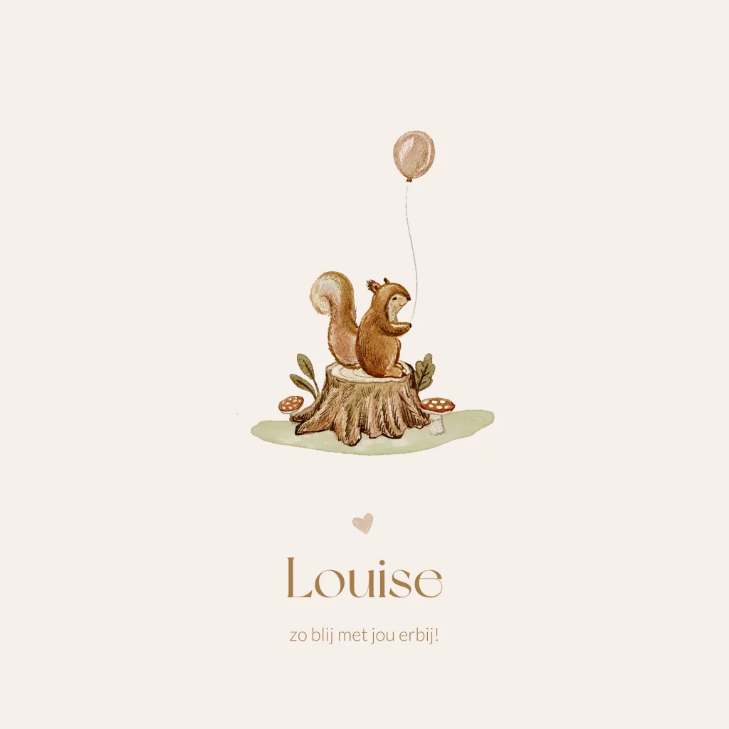 Bekijk onze geboortekaart voor een meisje, met mooie illustraties van eekhoorn op een boomstronk met roze ballon. Deze kaart is perfect om de geboorte van je dochtertje op een unieke manier aan te kondigen. Personaliseer de kaart eenvoudig en maak van dit moment een blijvende herinnering.