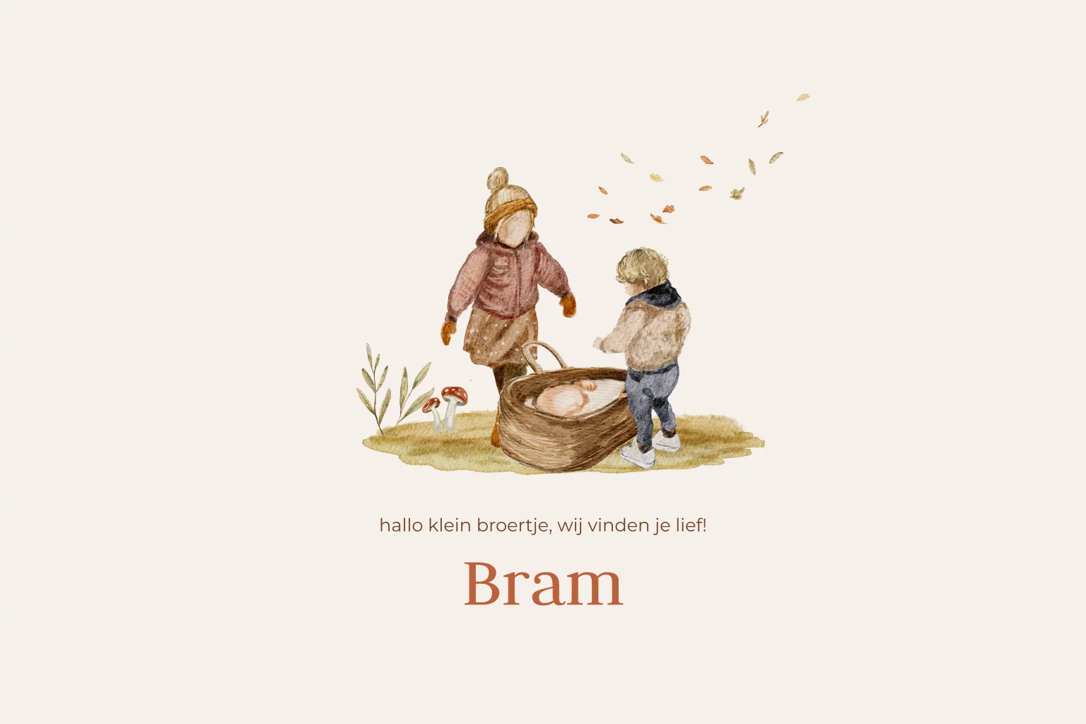Dit geboortekaartje voor een derde kindje is zo schattig. In het babymandje ligt een broertje en daaromheen staan een broertje en zusje. Prachtig geïllustreerd kaartje voor een herfst baby. Je kunt dit kaartje ook bewerken en illustraties van kindjes vervangen.