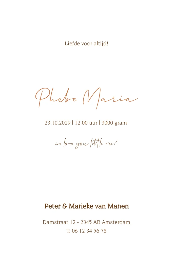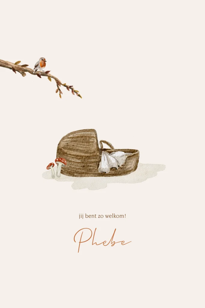 Geboortekaartje voor een herfst baby. In een mandje ligt een baby en ernaast staan paddestoelen. Op de boomtak zit een roodborstje. Dit kaartje heeft ronde hoeken.
