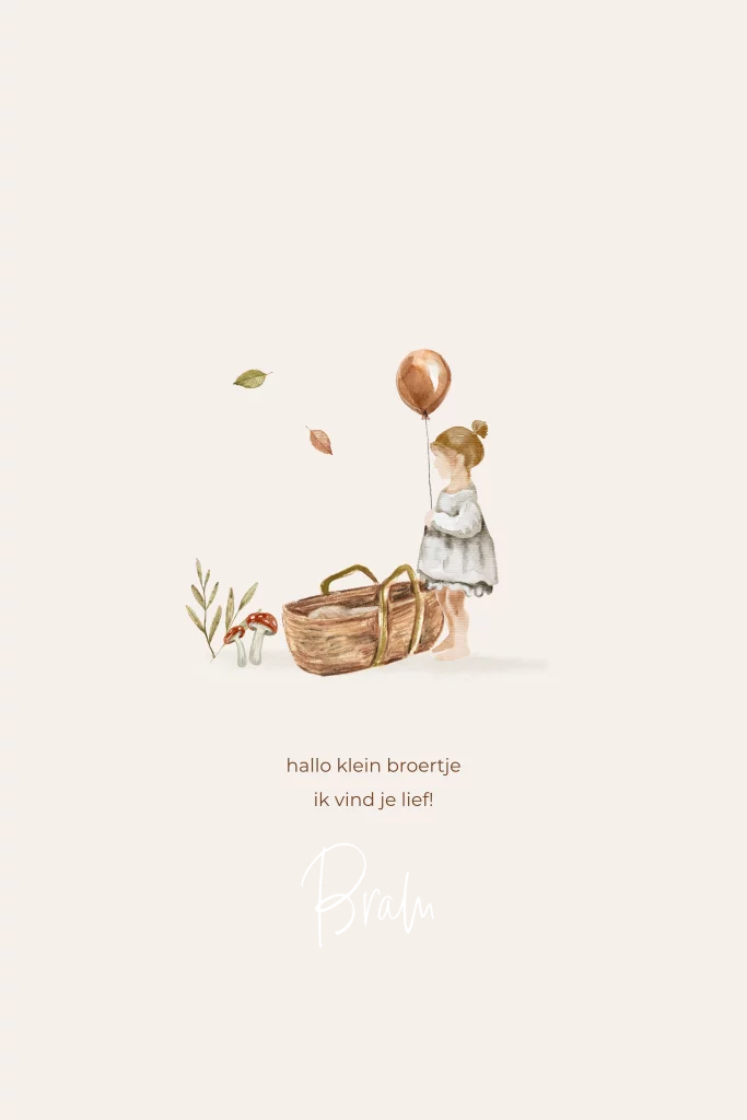 Origineel getekend geboortekaartje voor een herfst baby. Bij het kaartje staat een grote zus met een ballon bij een mandje met een baby. Door de lucht vliegen blaadjes en op de grond staan paddenstoelen. Lief babykaartje met ronde hoeken wat je zelf helemaal kunt aanpassen.