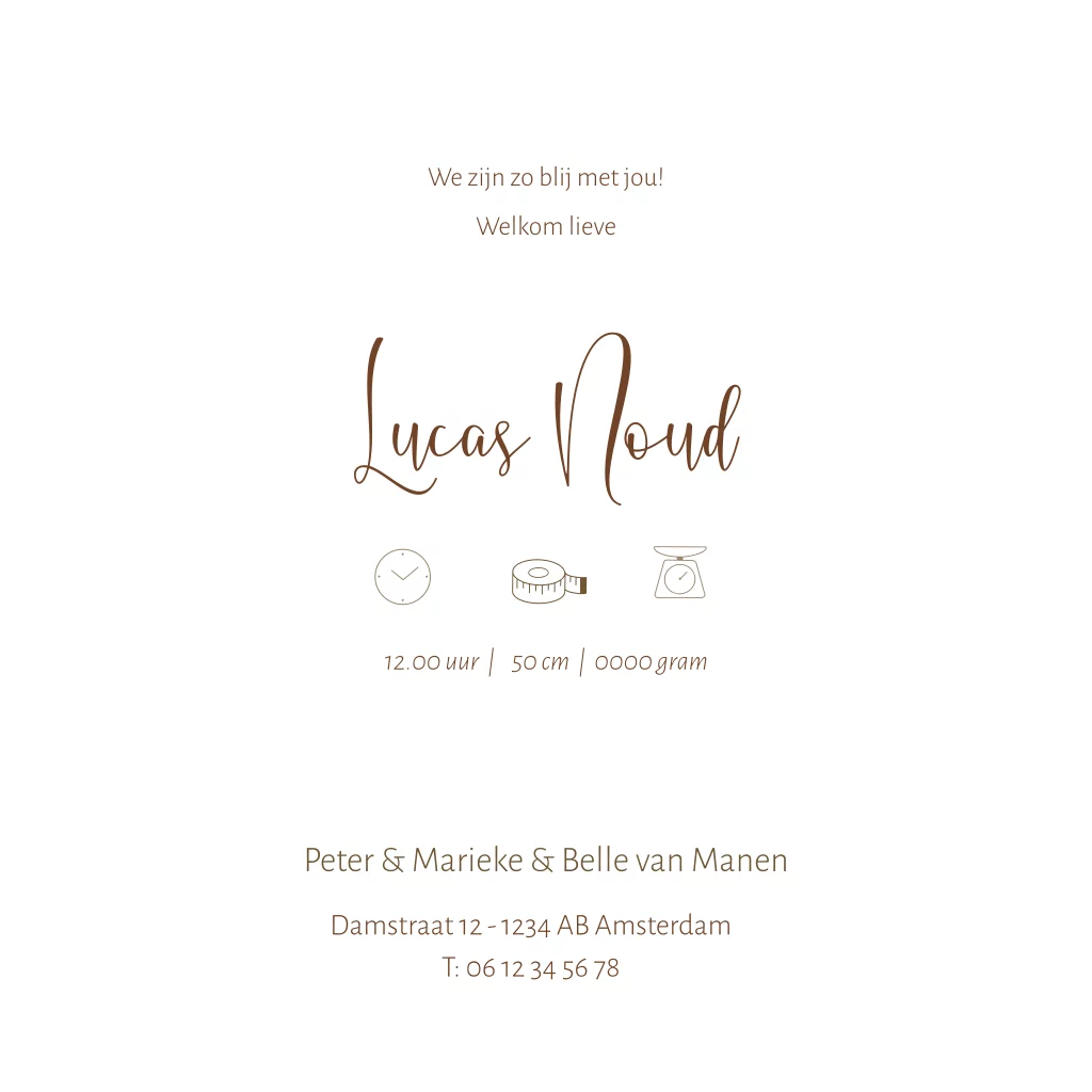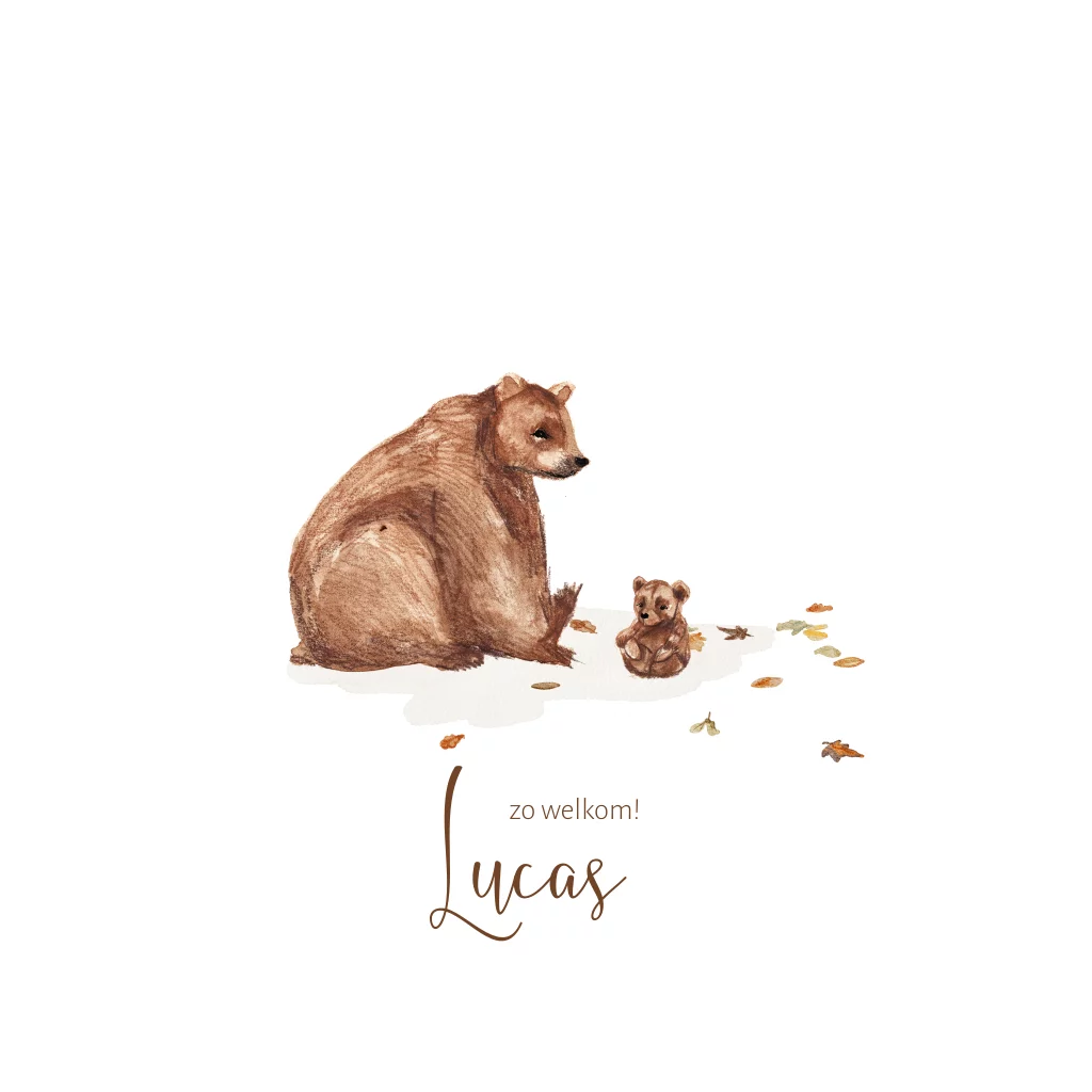 Dit stoere geboortekaartje voor een jongen heeft een getekende illustratie van beer met een klein beertje. Daaromheen wat vallende bladeren, wat het kaartje een herfst uitstraling geeft. De blaadjes kan je ook weghalen.