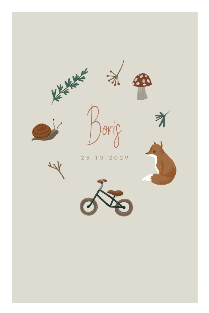 Geboortekaartje voor een jongen in een herfst thema. De buitenrand is wit en het kaartje heeft een creme achtergrond. Daarop staan illustraties als een vos een fiets, paddenstoelen en takjes.