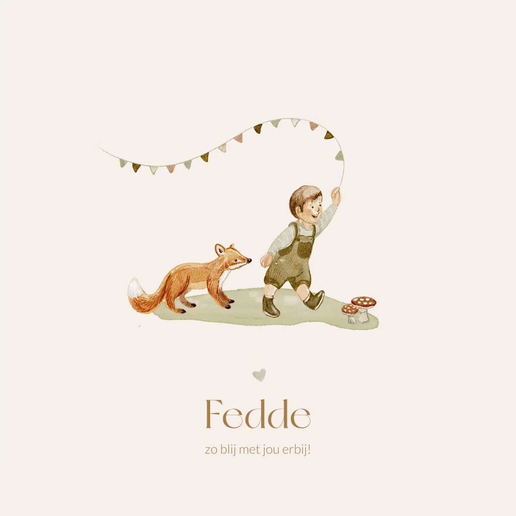 Schattig geboortekaartje met getekende illustraties. Het jongetje houdt een vlaggen lijn vast en daarachter loopt een vosje. De paddenstoelen geven het kaartje echt een herfst thema. Uniek geboortekaartje en leuk voor een herfstbaby. Personaliseer het kaartje in onze editor.