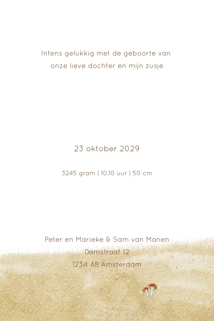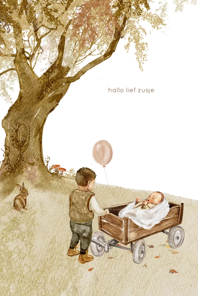 Wat een lief geboortekaartje is dit. Het kaartje is getekend en heeft een achtergrond met een mooie herfstboom. In het gras staat een bolderkar met een baby. Naast de boom zit een vrolijk konijn. Bij de kar staat een broertje die naar de baby kijkt. Je kunt dit jongetje ook vervangen door een meisje of meerdere kindjes als jullie een groter gezin hebben.