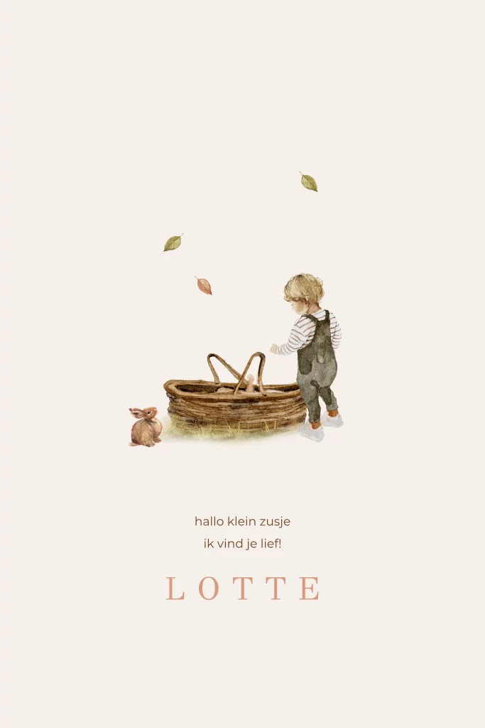 Origineel getekend geboortekaartje met een mandje met een baby. Bij het mandje staat een grote broer met een tuinbroekje aan. De blaadjes in de lucht en het konijntje geven het kaartje een herfst thema. Je kunt dit kaartje zelf helemaal bewerken.