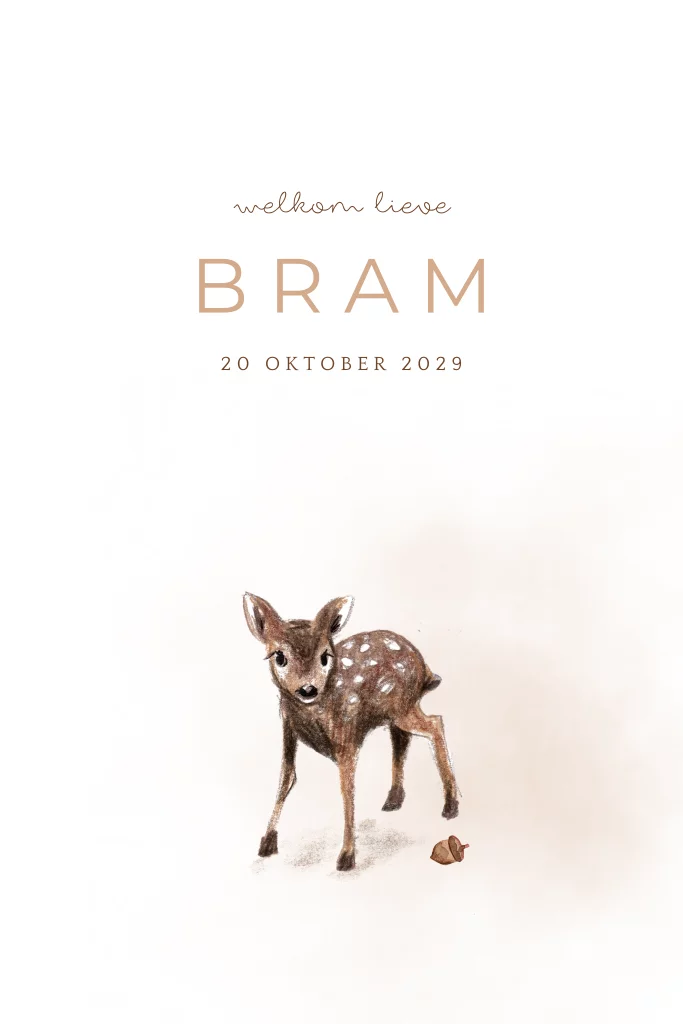 Illustratief geboortekaartje met een tekening van een lief hertje. Op de grond ligt een eikeltje. Dit kaartje past perfect bij een herfst baby. Op de achtergrond is heel licht een bruine waterverf te zien.