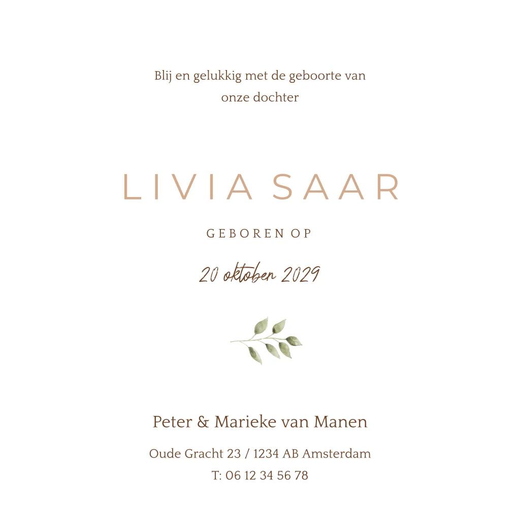 Geboortekaartje met een vos in een wiegje en een klein groen takje