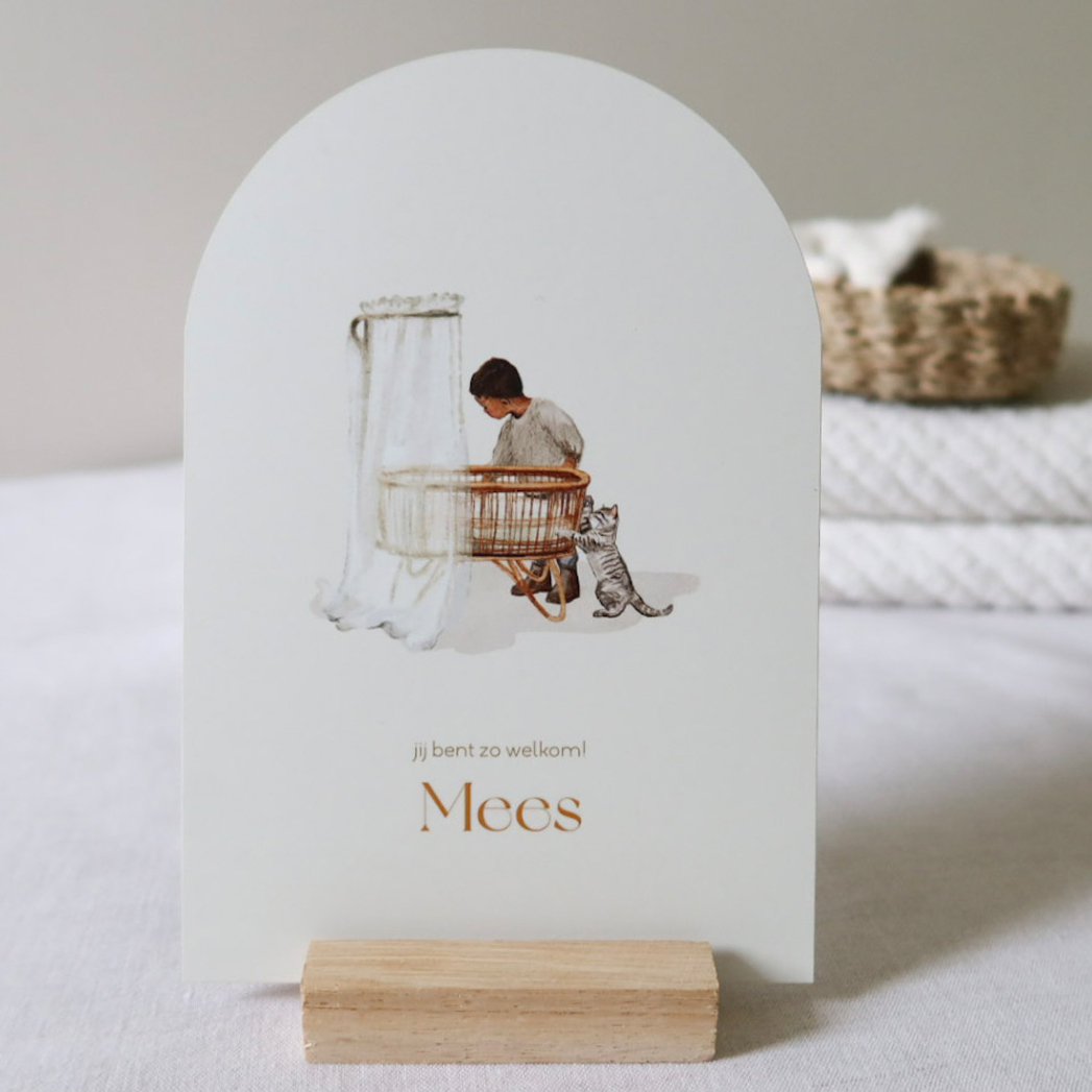 Huisdieren op je geboortekaartje zijn helemaal de trend van nu! Dit lieve geboortekaartje in boogvorm heeft een mooie aquarel illustratie van wiegje met een klamboe, Daarnaast staat een broertje in de wieg te kijken en de kat kijkt nieuwsgierig mee.Geboortekaartjes met huisdieren zijn heel populair. Heb je een andere kleur kat, dan kunnen we altijd de kleuren voor je aanpassen. De naam wordt gedrukt in glanzend goudfolie.