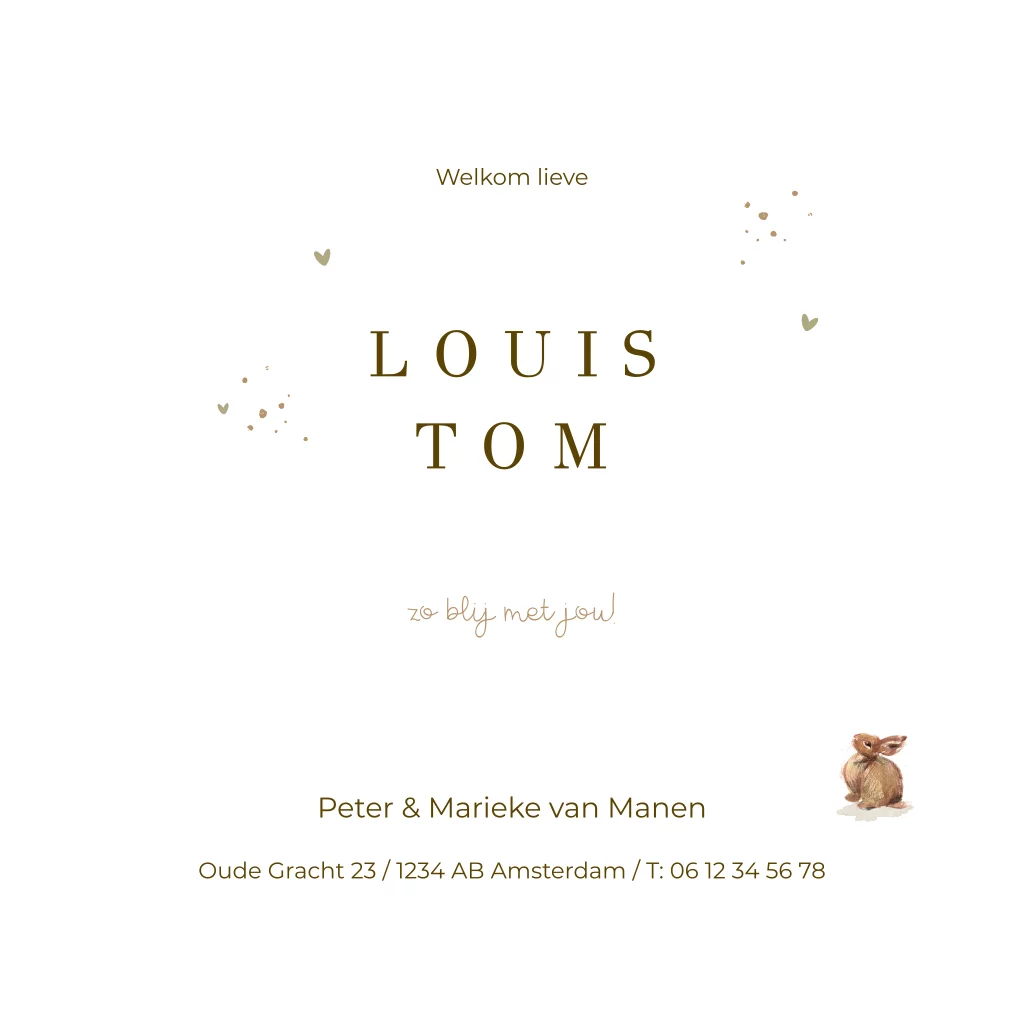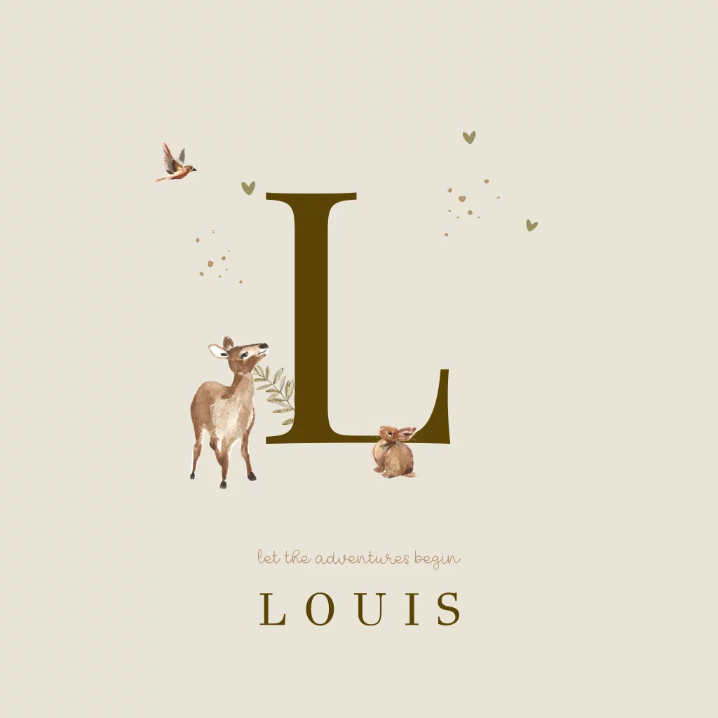 Lief getekend geboortekaartje voor een jongen met een initiaal in het midden van het kaartje. Daaromheen staan bosdieren zoals een hertje en een konijn. De illustraties staan los op het kaartje en kan je zelf bewerken en aanpassen. Leuk kaartje voor een herfst baby.