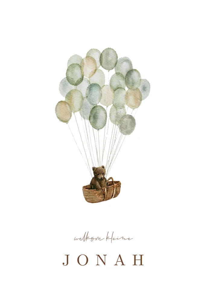 Uniek getekend geboortekaartje met een beertje in een mand met groene ballonnen. Dit staande dubbele kaartje is leuk voor een jongen. De illustratie is gemaakt met waterverf wat het kaartje een heel mooie look geeft.