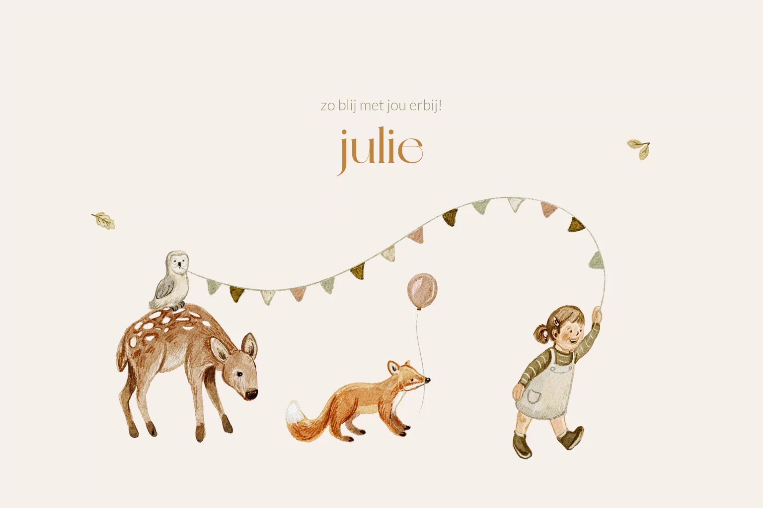 Ontdek deze vrolijke geboortekaart voor een meisje, met mooie illustraties van een hertje en een vos. Deze kaart is perfect om de geboorte van je dochtertje op een unieke manier aan te kondigen. Het ontwerp met het het meisje met een vlaggenlijn en daar achter een vos en een hertje geven de kaart een vrolijk karakter. Personaliseer de kaart eenvoudig in onze editor. De illustraties kan je zelf aanpassen en eventueel andere toevoegen.