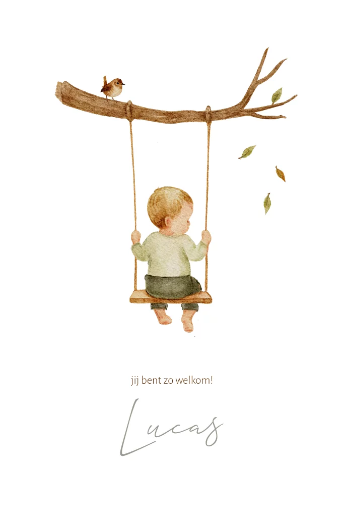 Geboortekaartje voor een jongen. Dit kaartje bevat een illustratie van een jongen op een schommel aan een tak. Daarbij dwarrelen een paar blaadjes. Op de tak zit een vogel. Bewerk dit kaartje voor jullie zoon en maak zo een uniek geboortekaartje voor jullie kleintje.