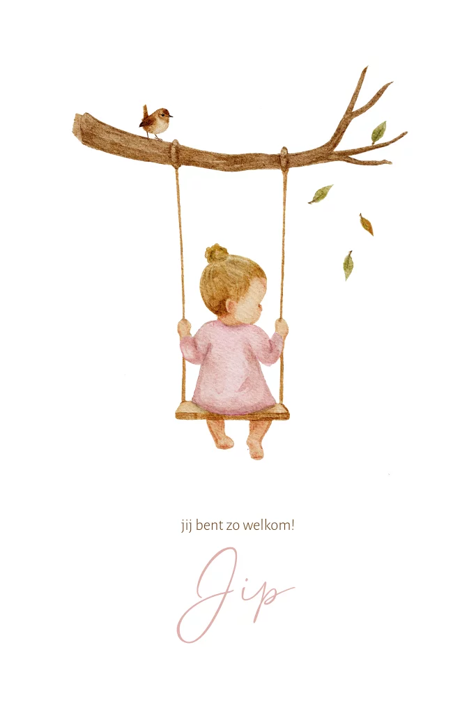 Geboortekaartje voor een meisje. Dit kaartje bevat een illustratie van een meisje op een schommel aan een tak. Daarbij dwarrelen een paar blaadjes. Op de tak zit een vogel. Bewerk dit kaartje voor jullie dochter en maak zo een uniek geboortekaartje voor jullie kleintje.