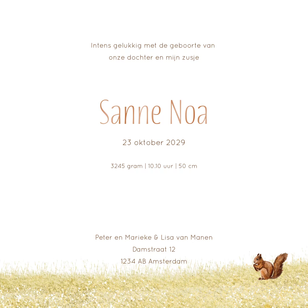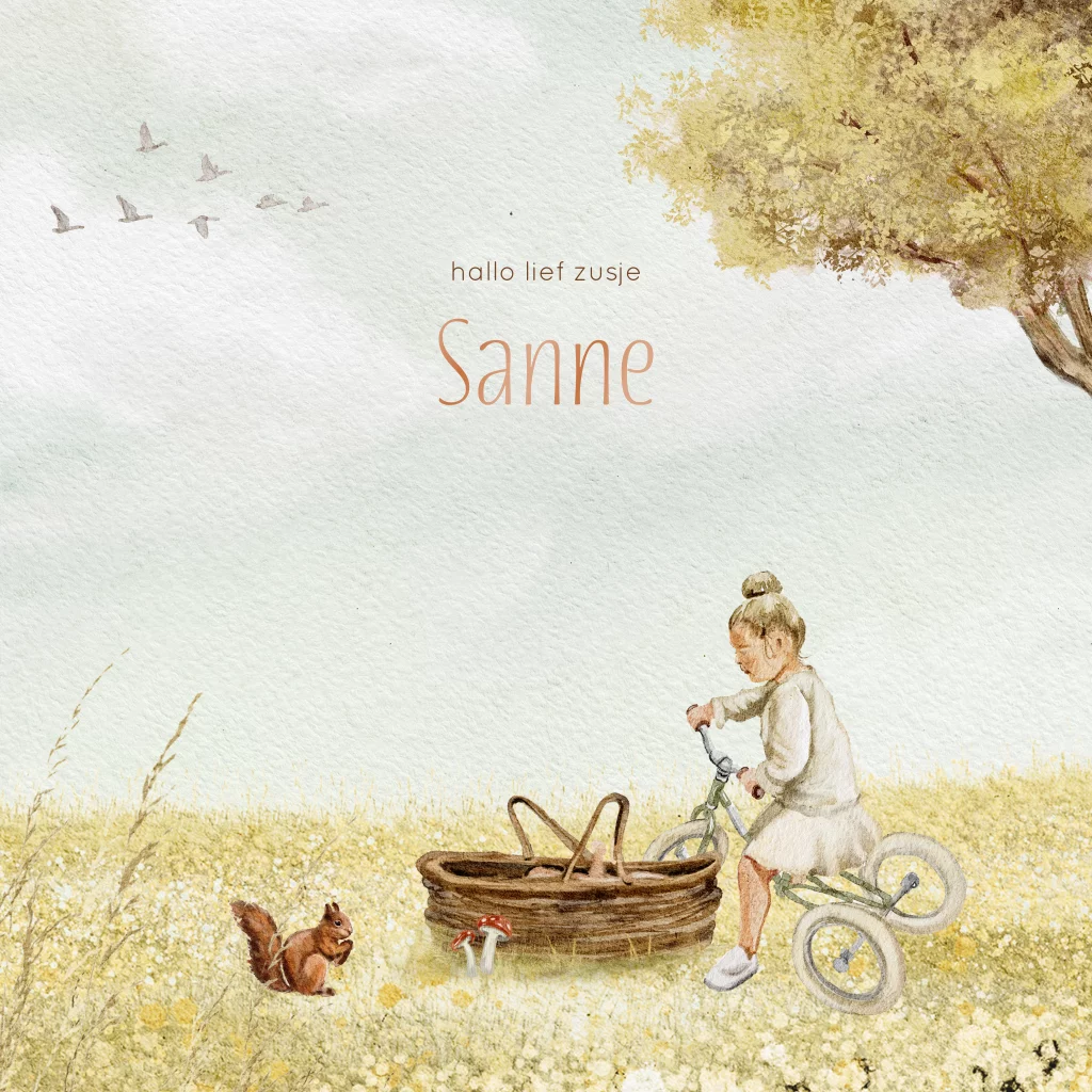 Uniek geschilderd geboortekaartje in een herfst thema. Het kaartje heeft een mooie lucht met een boom in warme tinten. Op het gras staat een mandje met een baby en daarnaast een oudere zus op een fietsje. Alle illustraties op dit zomerkaartje voor jullie meisje kan je helemaal zelf aanpassen en bewerken. Als je het meisje op de fiets verwijdert is het een leuk kaartje als jullie een eerste kindje krijgen. De naam wordt gedrukt in een glanzende koper kleur.