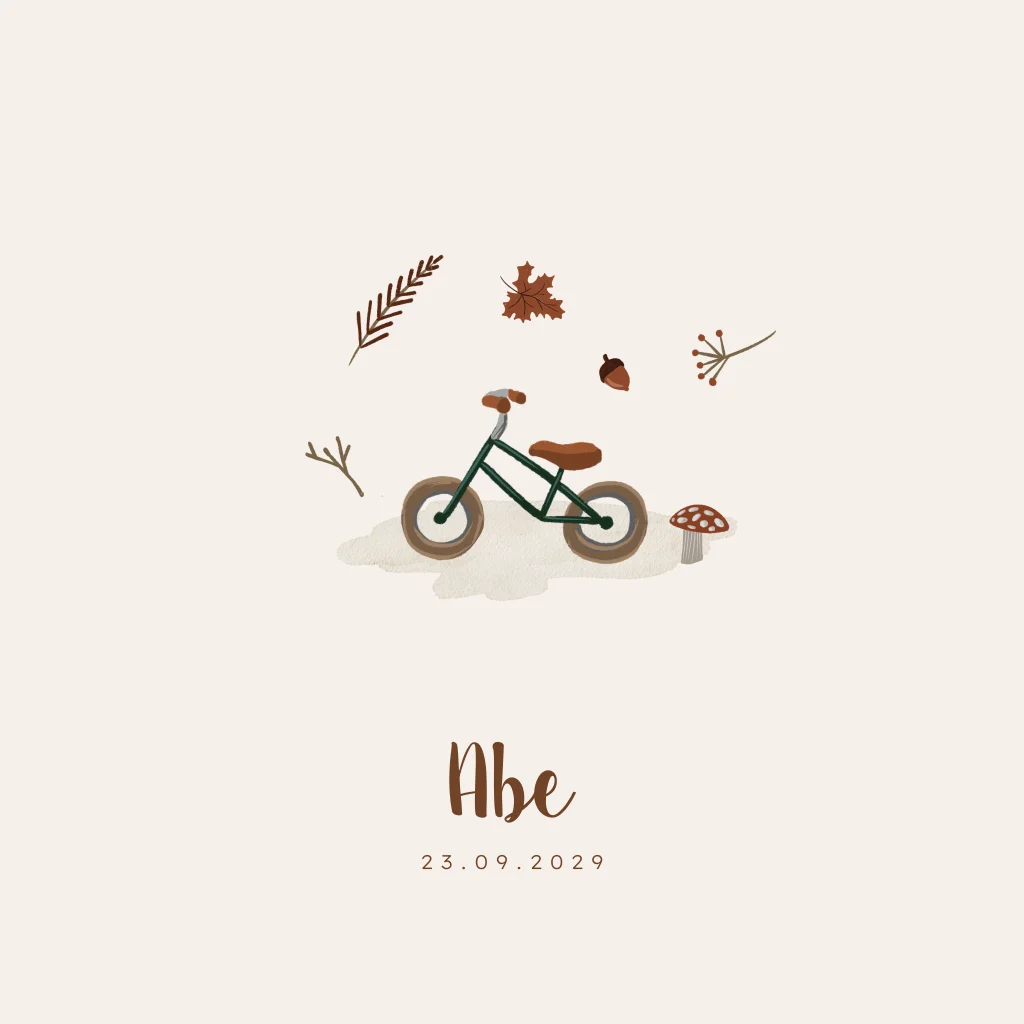 Lief vierkant geboortekaartje voor een jongen. Op het kaartje staat een fiets met daaromheen herfst elementen als bladeren en paddenstoeltjes.