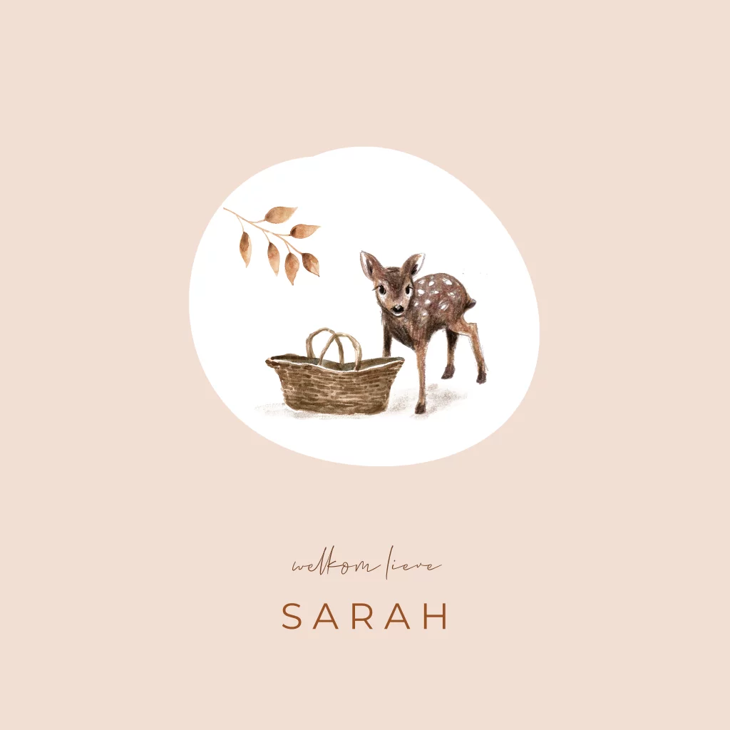 Lief meisjes geboortekaartje met een roze achtergrond. In een wit rond vlak staat een getekend hertje bij een baby mandje. Je kunt dit kaartje eenvoudig bewerken en eventueel voorzien van andere dieren en illustraties.