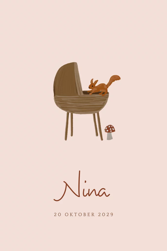 Lief getekend geboortekaartje met een roze achtergrond. Dit meisjeskaartje heeft een wieg en daarop een eekhoorn illustratie. Op de grond staat een paddenstoel. Mooi kaartje voor als jullie dochter in de herfst wordt geboren. Dit kaartje kan je zelf aanpassen met andere illustraties.