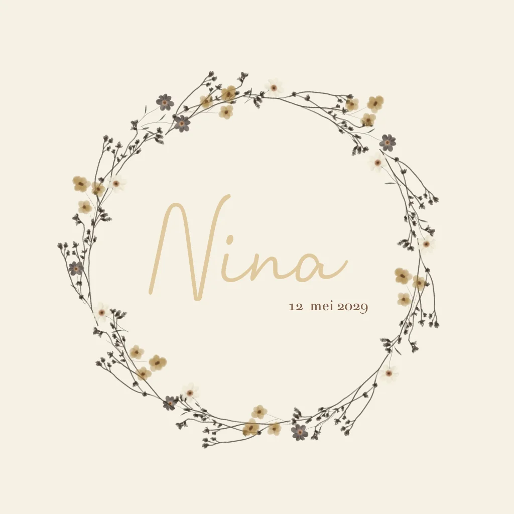 Een mooi geboortekaartje met een krans van takjes en lieve kleine bloemetjes. Een mooi kaartje in naturel tinten en is mooi voor een herfstbaby.