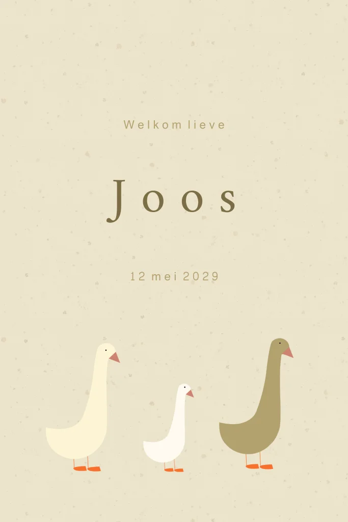 Mooi geboortekaartjes met gansjesfamilie voor je zoon of dochter. Plaats voor elk familielid een gansje op het geboortekaartje. De kleuren en tekst kunnen worden aangepast.