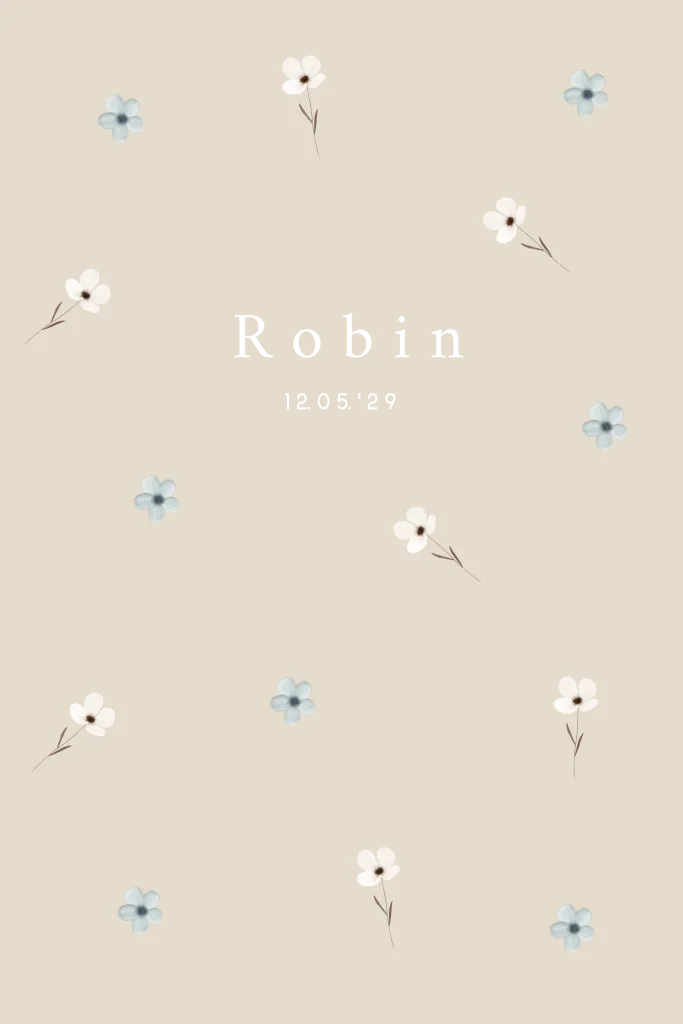 Een mooi geboortekaartje in lieve zachte kleuren met lichtblauw en witte bloemen. De kleuren van de tekst en de achtergrond kunnen gewijzigd worden.
