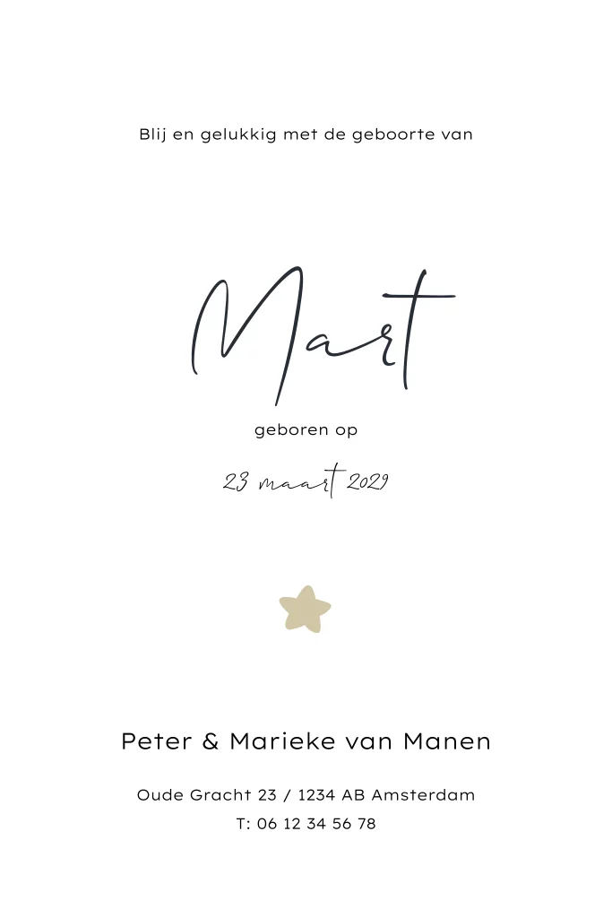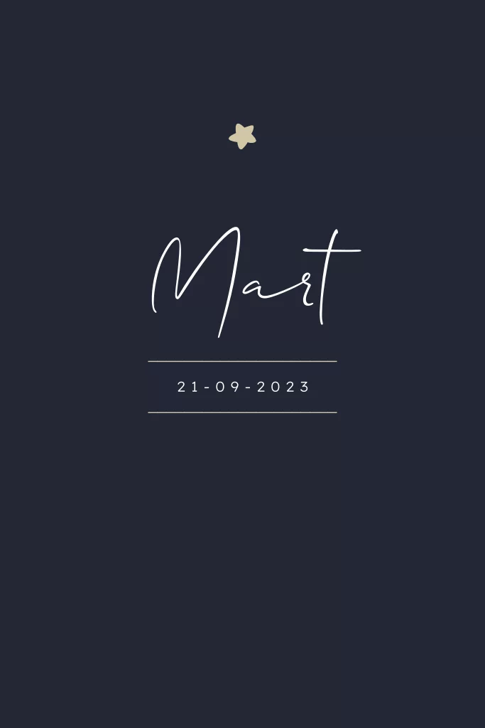 Donkerblauw dubbel geboortekaartje voor een jongen met een bruin sterretje. Stoer babykaartje voor een zoon wat je helemaal zelf kunt bewerken en aanpassen.